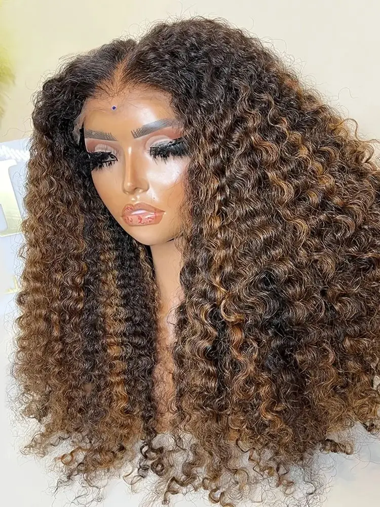 26Inch Soft Preplucked Highlight Brown180Density kinky Curly Lace Front Wig Synthetic Baby Hair Glueless Daily Wear Wig