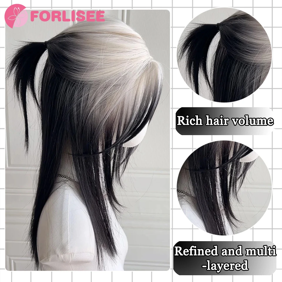 FORLISEE 20 Inch Black And White Mullet Head Wig Synthetic Straight Fluffy Natural Wolf Tail Hair for Daily Use Party Cosplay