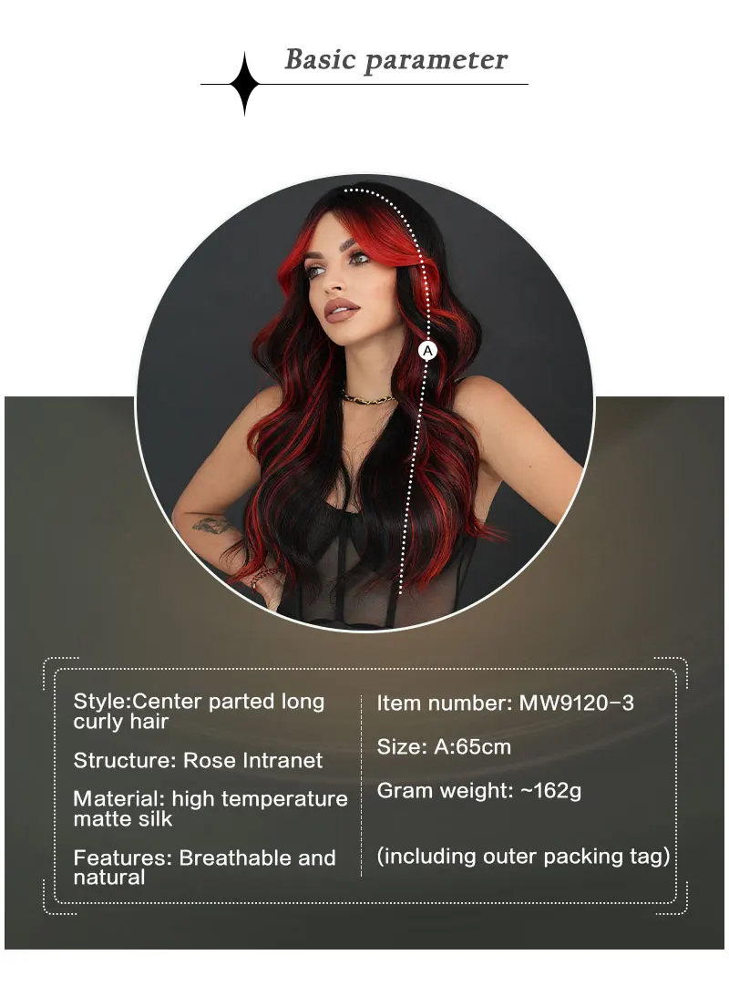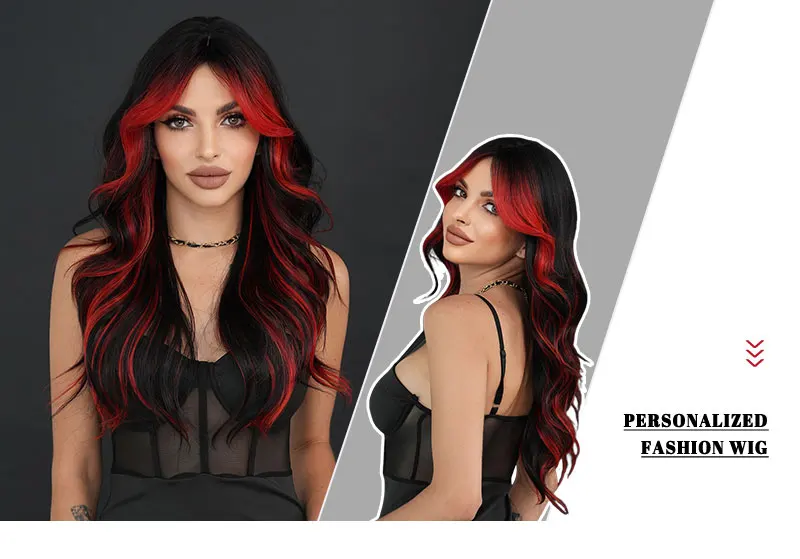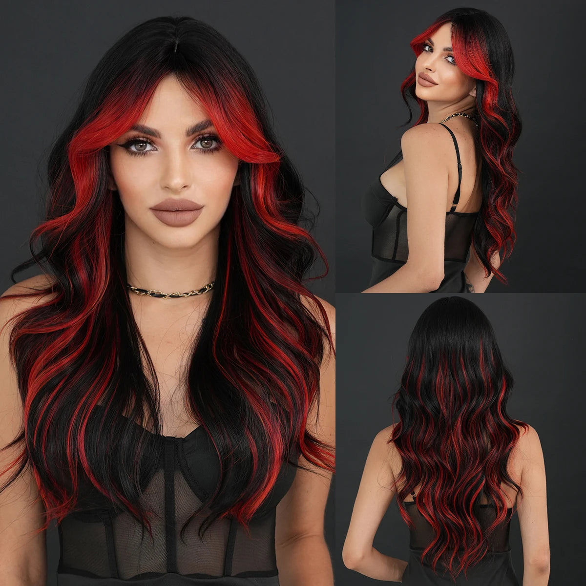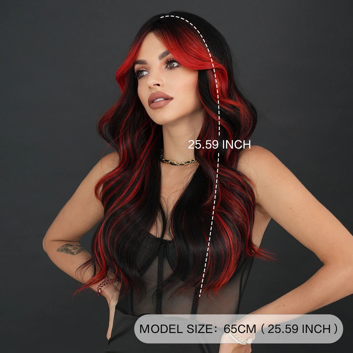 【Name】NAMM Highlight Skunk Red Wig Body Wave Synthetic Black Wig for Women Daily Party Use Highlight Red Wavy Wigs with Fluffy Bangs