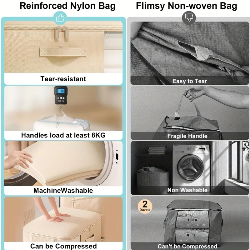 3.Reinforced Handle: The storage organizer's handles are reinforced with two additional layers of thick fabric to double the load-bearing capacity. These storage bags are easy to carry and transport when you move or load heavy items.